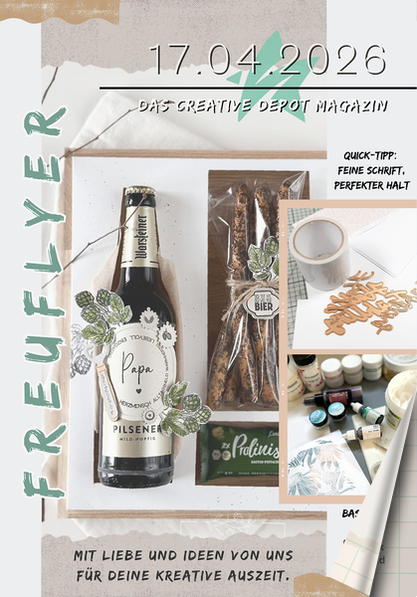 17.04.2026FREUFLYERREYLFUERFDa s Crea tiv e Depo t Ma ga zinMit Liebe u n d Ideen v o n u n sfü r dein e krea tiv e A u s Zeit.Quick-Tipp:Feine Schrift,perfekter HaltBasteltipp:Pasteneinfärben