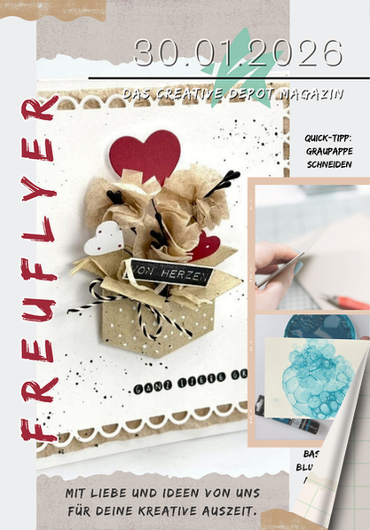 30.01.2026FREUFLYERREYLFUERFDa s Crea tiv e Depo t Ma ga zinMit Liebe u n d Ideen v o n u n sfü r dein e krea tiv e A u s Zeit.Quick-Tipp:GraupappeschneidenBasteltipp:Blubberliebeauf Papier